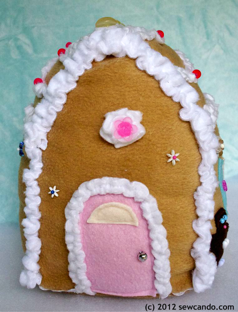 After getting most of those doodads sewn on, with right sides together, stitch the tops of the sides to the sides of the roof piece and then stitch the peaked sides. Then sew together the open sides so the house shape is all in place and then sew the bottom edges onto the sides, but leave a 7.5cm gap to turn it right side out. Stuff with polyfill and slipstitch the gap closed. Finish by hand stitching the frosting on the edges of the roof and sides.