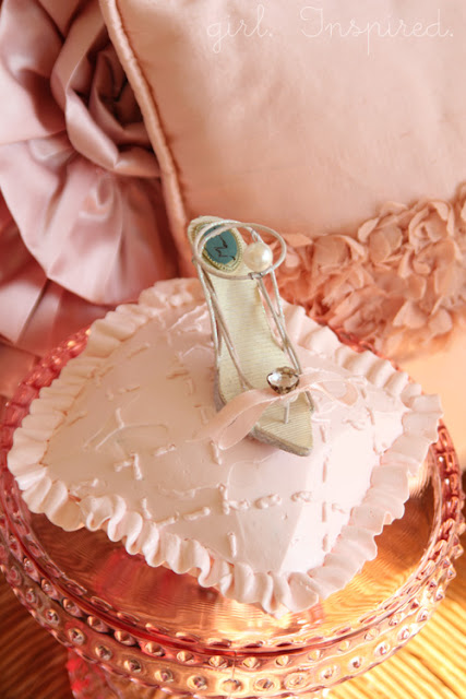 Then, I frosted the cake as smooth as I could with more buttercream and added a ruffled edge around the rim, just like a ruffle in the seam of a pillow.  I piped a dashed line in a quilt-like pattern across the top to look like stitching, but I’m not sure that my hand was steady enough for supreme results.  Haha! I plopped a little decorative shoe on top to complete the look.  Isn’t that fun?