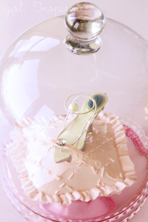 Then, I frosted the cake as smooth as I could with more buttercream and added a ruffled edge around the rim, just like a ruffle in the seam of a pillow. I piped a dashed line in a quilt-like pattern across the top to look like stitching, but I’m not sure that my hand was steady enough for supreme results. Haha! I plopped a little decorative shoe on top to complete the look. Isn’t that fun?